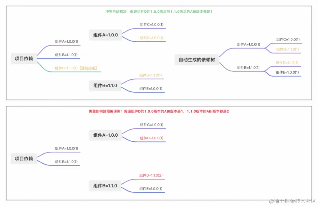 此外,在ABI兼容的前提下,我们通过强制指定冲突组件版本,实现自动解决冲突而无需重新编译子组件,以此满足组件高稳定基础上的高效管理需求。