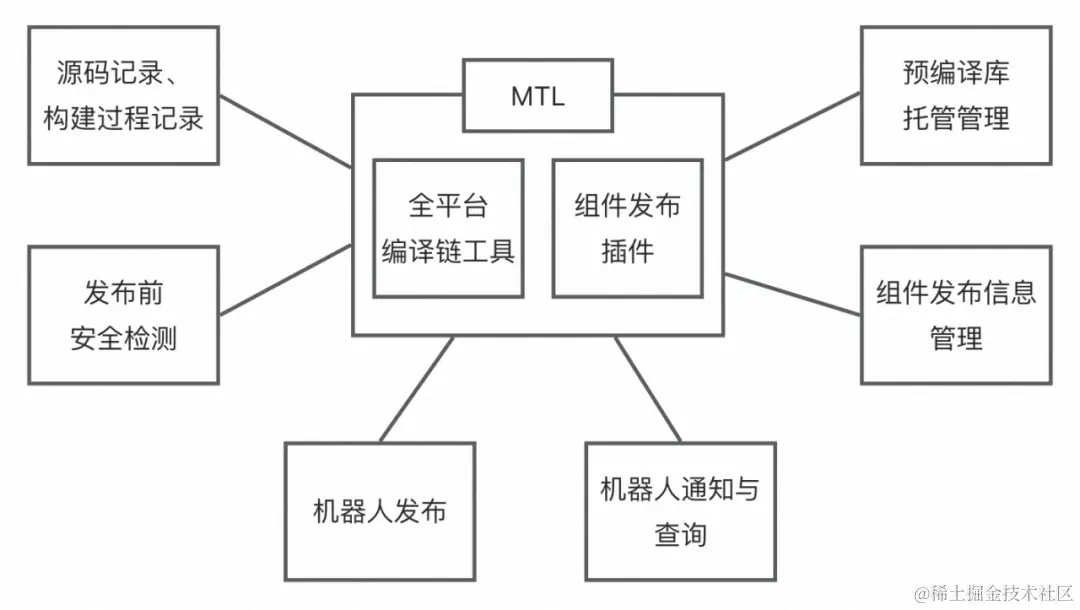 虽然要解决的问题很多,但这在效率上的收益值得我们去逐一攻克。为解决上述问题,我们基于集团的MTL,编写了插件、提供了各平台统一的编译链工具、发布前自动化安全检测、提供机器人提高发布效率等,以此实现组件构建和发布环节的高效管理。