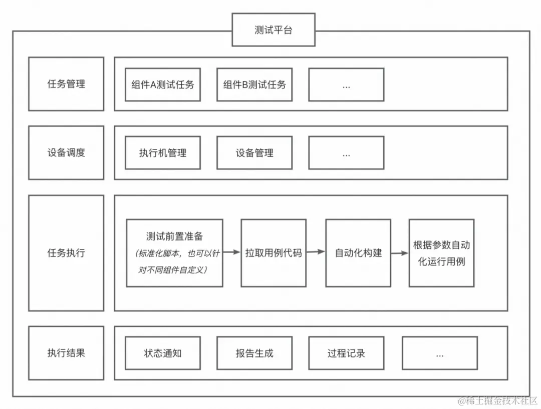 基于此,我们提供完整的测试平台进行实现,组件只需在平台上配置好一次任务,后续的所有版本都可以重复使用。我们也提供了各个平台所需的设备,组件开发者只需要编写好测试用例,其他的所有事情都可以自动化完成,这不但提高了组件的开发效率,同时也保障了组件的稳定性。