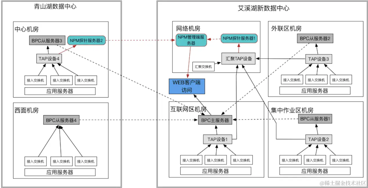 - (5)NPM系统在艾溪湖数据中心部署一台管理端服务器,并在每个数据中心各部署一台NPM探针服务器,通过分布式部署、捕获数据,集中监控展示的方式,监控两个数据中心的各业务系统的网络性能;