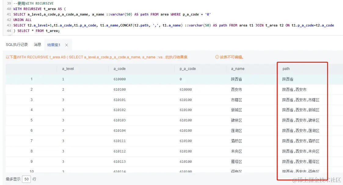 示例说明:这个查询使用了递归表达式来遍历省级行政区域关系。表达式使用了两个 SELECT 语句:第一个 SELECT 语句选取了所有父级代码为0的行政区域信息,并将它们添加到临时表 t_area 中。它们的层级选取初始化的a_level级,并且它们的路径被设置为它们的行政区名a_name。这个 SELECT 语句是递归查询的起点。第二个 SELECT 语句连接了 area表和t_area表。它选取了area表中所有具有父级行政区,并连接到t_area表中已经存在的行政区。对于每个连接的行,它们的层级是父级的层级加1,并且它们的路径是父级的路径加上逗号和它们自己的行政区。查询结果返回t_area表中所有的行政区信息。