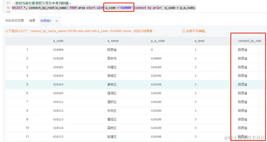 SELECT *, connect_by_root(a_name) FROM area start with a_code ='610000' connect by prior a_code = p_a_code;