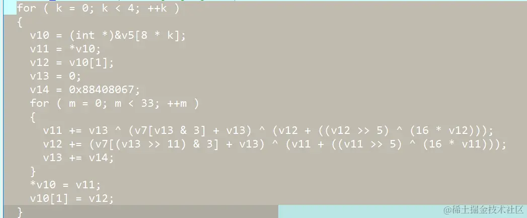 l -= (((r << 4) ^ (r >> 5)) + r) ^ (sum + key[sum & 3])^sum;