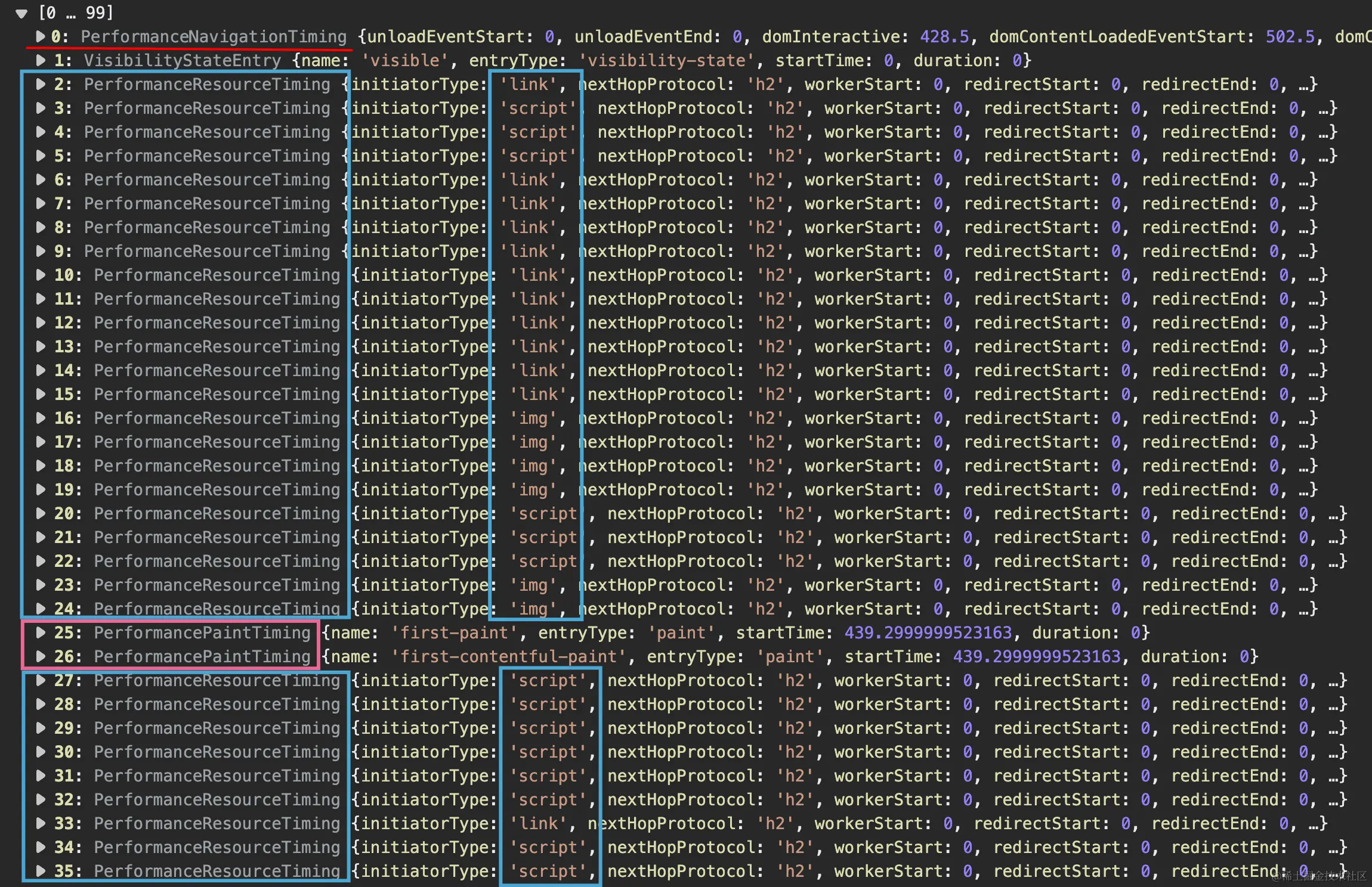 其中window.performance.getEntries()获取到的是个数组,里面包含一系列 API,并且同时存在多种 API,以下是浏览器打印的结果