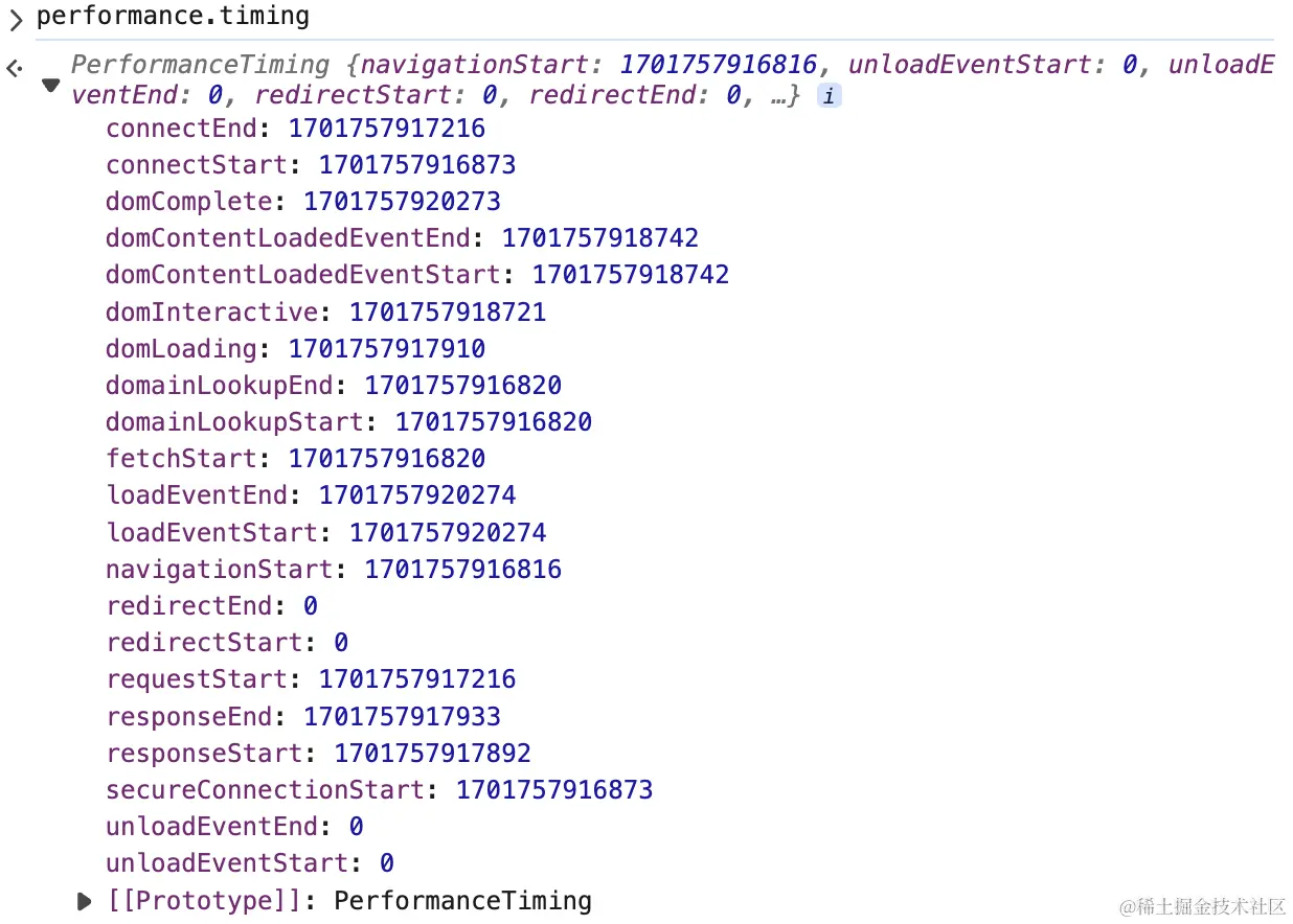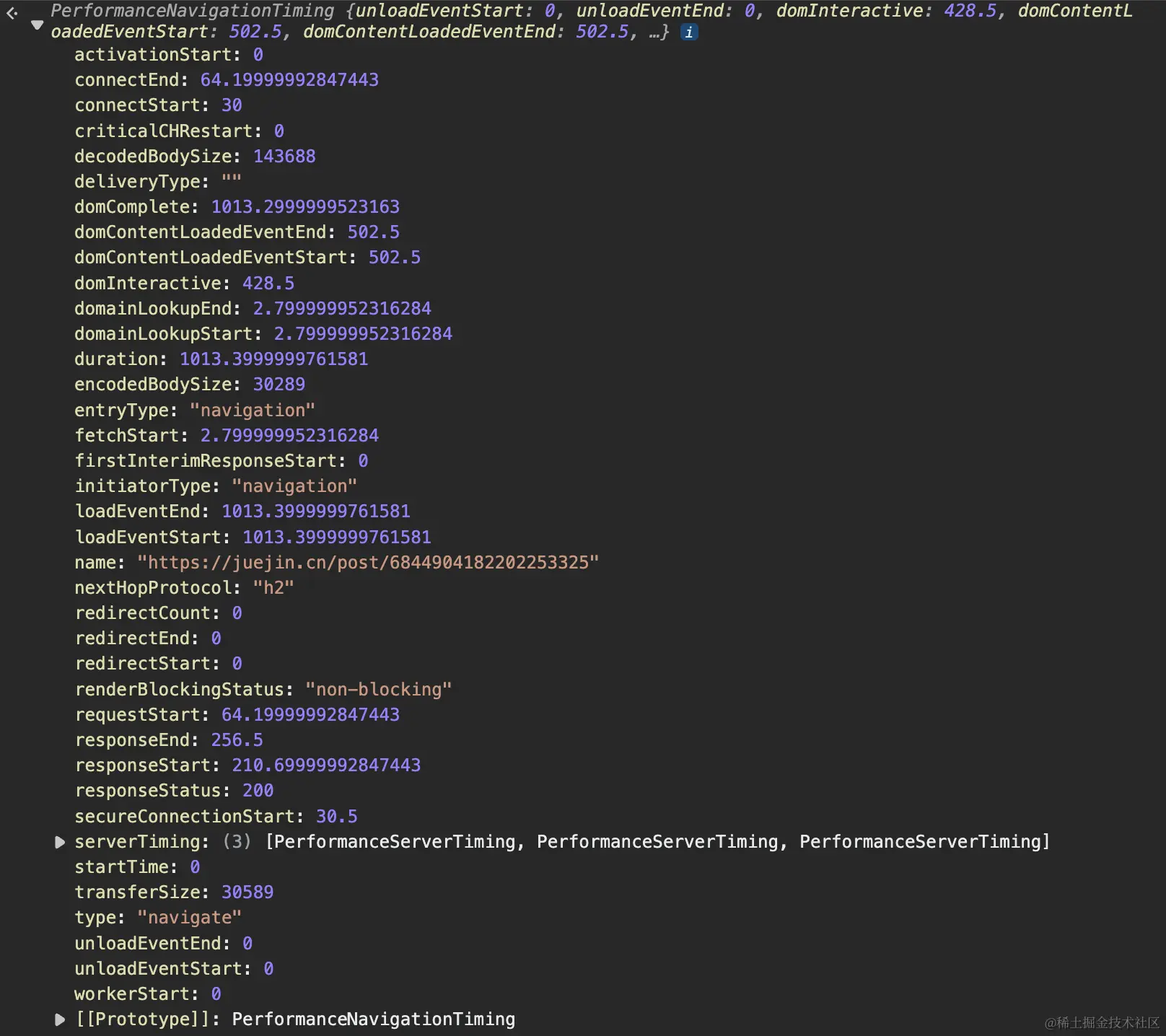 通过window.performance.getEntries()[0]获取,浏览器打印结果如下: