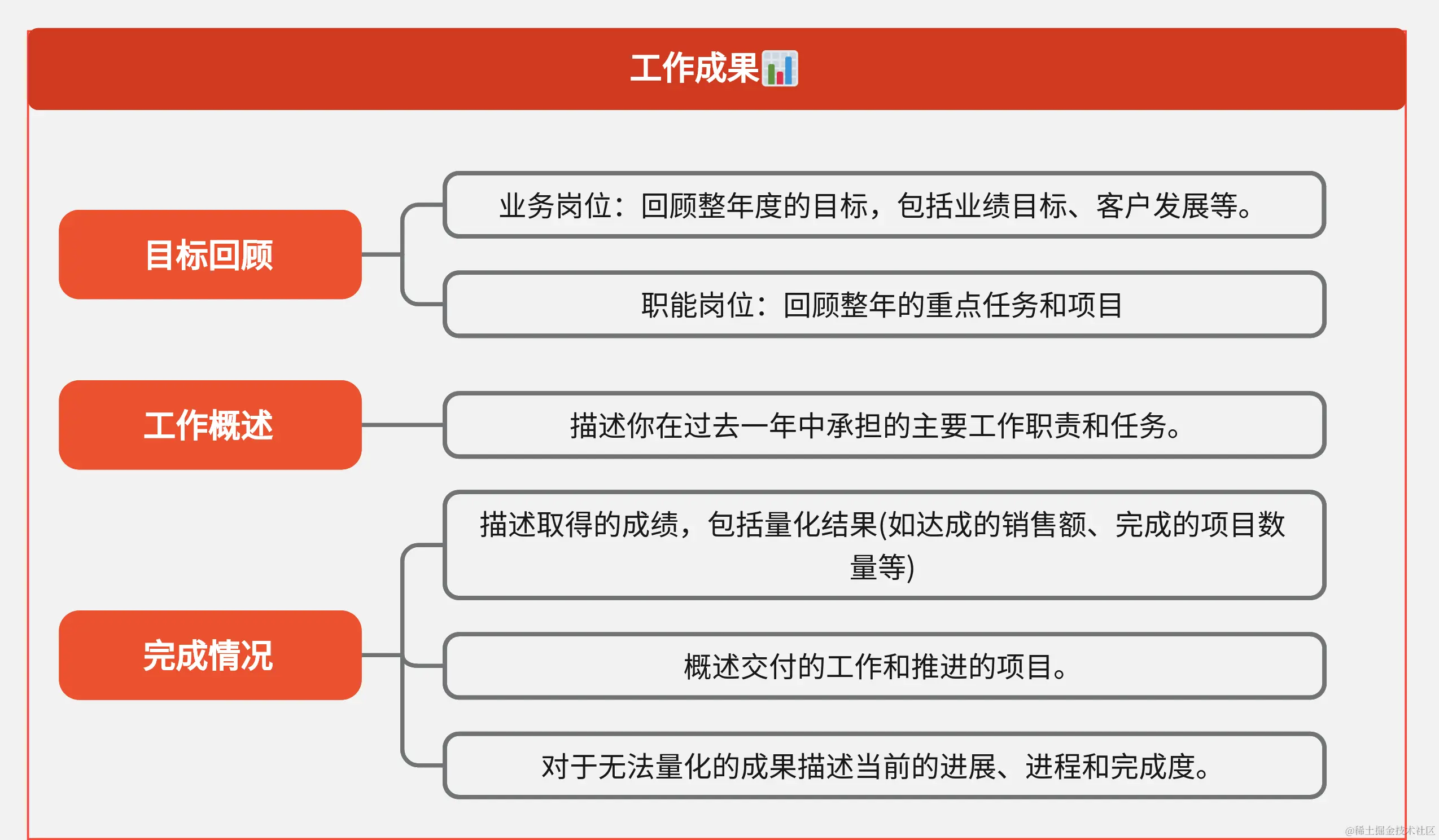 撰写工作总结时,我们可以采用下图的「年终总结万能公式」提供的框架,划分为4大模块——