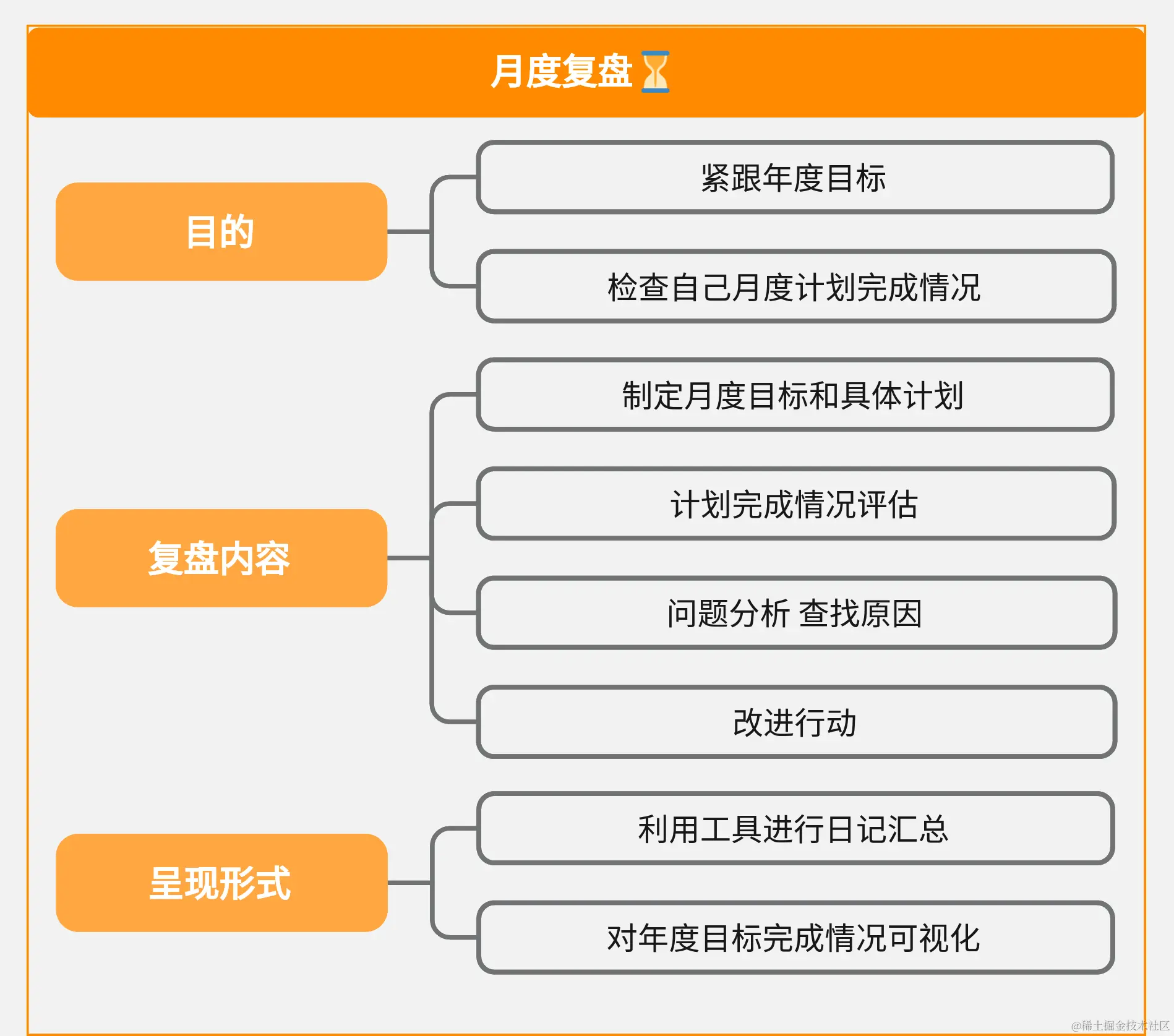 在进行复盘时,可以参照下图的「复盘公式」提供的框架来进行,最常见的是按照时间维度来划分——每日复盘、每周复盘、月度复盘和年度复盘。