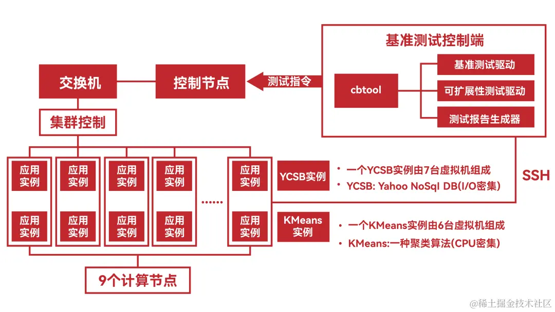 SPEC Cloud IaaS 2018 Benchmark是SPEC开发的基于大数据场景下的云基准标准测试套件,用以衡量云计算的性能,Benchmark基准测试模型主要测试的是IaaS云平台性能。SPEC Cloud IaaS 2018通过创建NoSQL(Cassandra)实例实现YCSB架构,其测试项包括吞吐量、插入响应时间、读取响应时间、平均应用实例(Application Instance)配置时间。SPEC Cloud IaaS 2018基准测试使用HiBench KMeans实现计算密集型测试,测试项包括完成时间、每个应用实例运行的Hadoop迭代计数、平均应用实例配置时间。