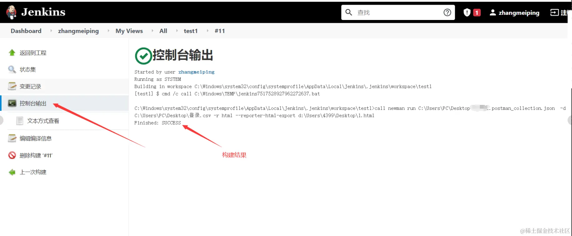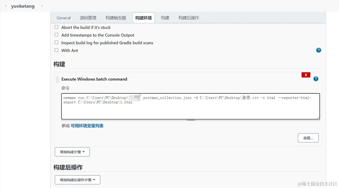 注意:jenkins执行命令,会把命令生成一个批处理文件执行,而newman命令对于批处理来说是外部命令,所以要加call表示调用。而jenkins执行windows命令,若退出代码不为0 ,则jenkins会将构建标记为失败,所以需要加上exit 0表示执行完成退出