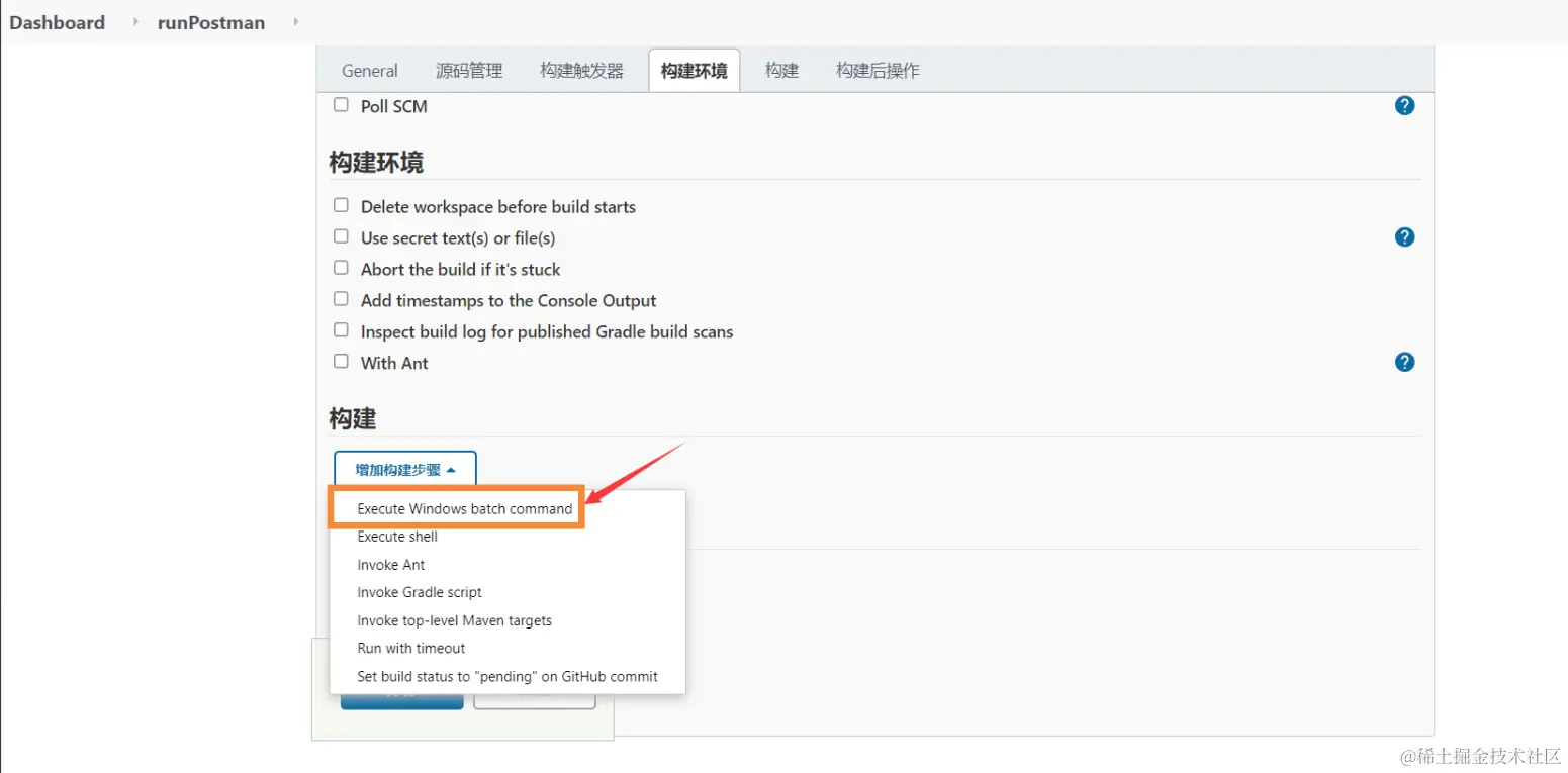 3、在构建时,添加构建步骤选择执行windows批处理命令