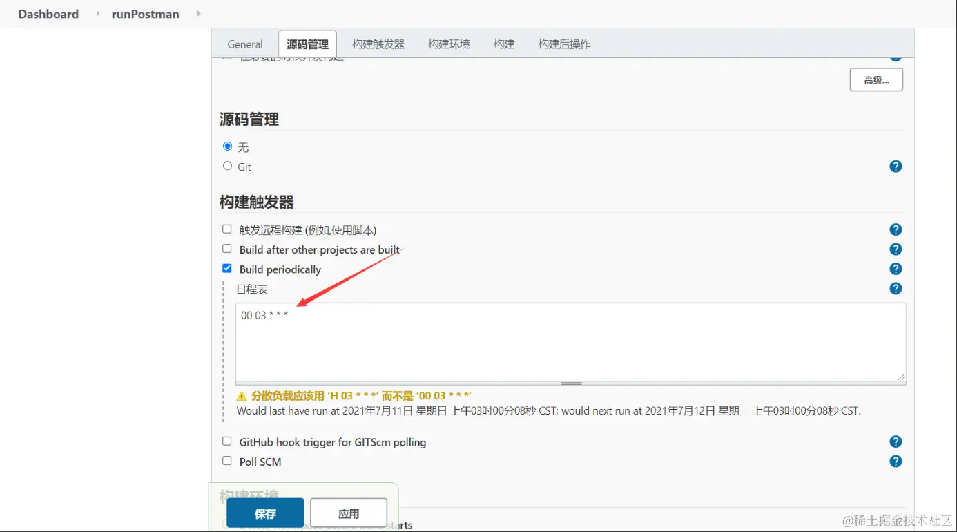 2、在构建触发器里,配置定时构建选项,指定任务定时执行。 五个参数分别代表 分 时 天 月 星期 的周期维度。