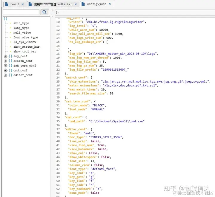 HHDESK右键管理简介 恒辉信达 2023-12-08 86 阅读1分钟 在HHDESK管理文件,除了基本的打开、删除、复制、粘贴、重命名外,还有多种便捷编辑方式。 可以分别以下列模式打开文档: 文本模式即是以文本编辑器打开文档。 1 二进制模式 可进行二进制编辑。 2 JSON模式 可对JSON文件进行直观的解析。 左侧配有节点框,方便操作与浏览; 树形结构可以打开、收拢,进行拖动操作,调整文档顺序; 右键-类型,可以进行选取操作; 左键对文档进行选取之后,可以直接拖动选取内容,进行操作。 3 按钮模式 可以直接设置脚本;