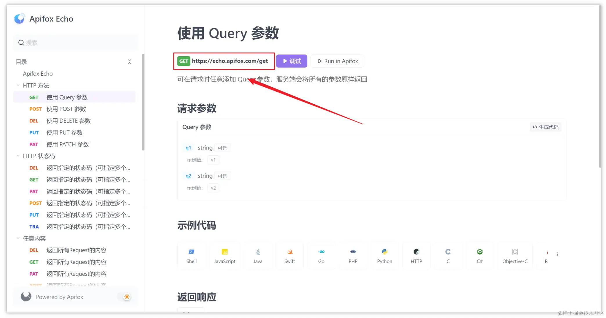 为了便于测试,所以案例使用 Apifox 提供的开放 API 来测试,测试的 API 路径为:https://echo.apifox.com/get?q1=v1