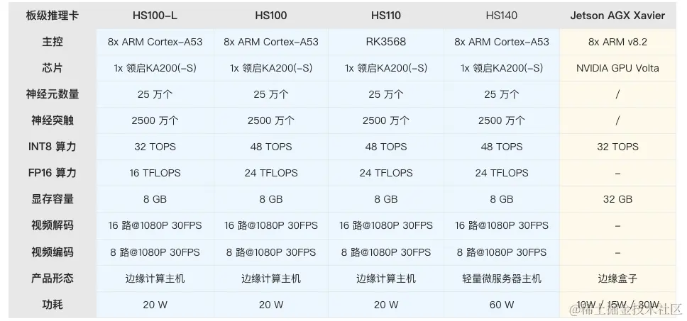 来分析一下,灵汐的几款边缘计算设备上的 NPU 能力都来自一颗领启 KA200(-S),区别主要在主控和外设上,而外设的参数过多,这里就没有罗列了 (如有兴趣可自行查阅)。而一颗领启 KA200(-S) 提供的算力在边缘场景已经是很能打了,已经是轻松超越英伟达 Jetson AGX Xavier 的存在。所以基本可以这么总结:灵汐的边缘计算产品,性能都差不多,主要按外设配置来区分产品级别、对应不同的应用场景。