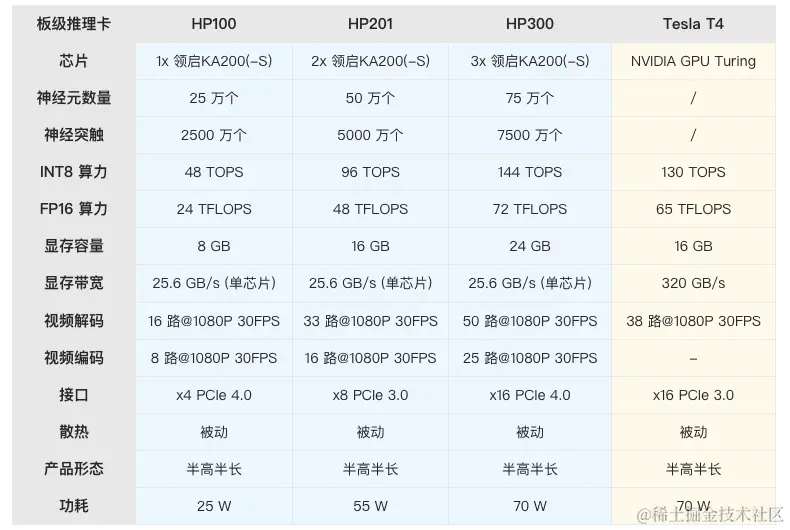 对于类脑板级产品,灵汐有三款板卡,主要面向推理场景,分别是 HP100、HP201 和 HP300,区别就在 HP100 用了一颗芯片、HP201 用了两颗芯片、HP300 用了三颗芯片,然后三个不同级别算力的卡就可以用于不同的应用场景,这种产品的 "纵深感" 设计简单而清晰。下面我整理了 HP100、HP201、HP300 的性能参数,加入英伟达的 T4 卡进行对比,如下,