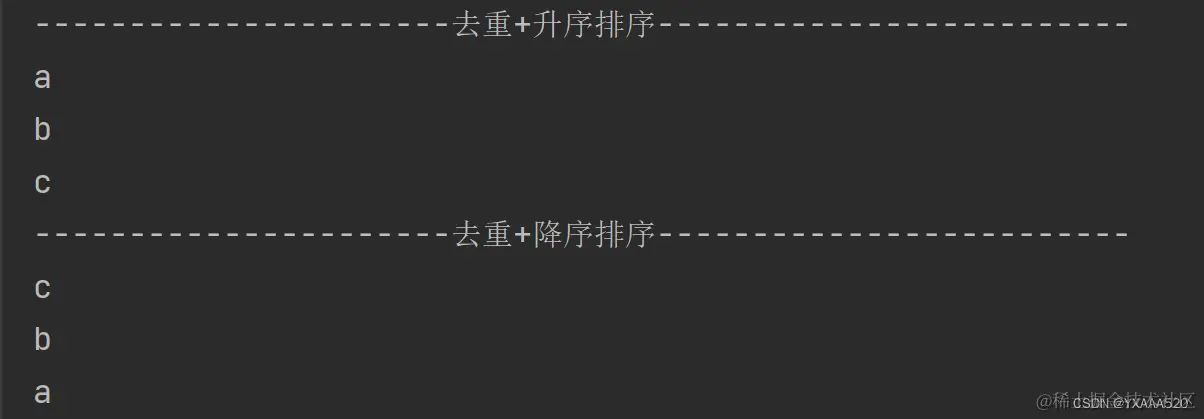 System.out.println("----------------------去重+升序排序-------------------------");