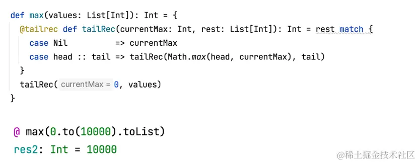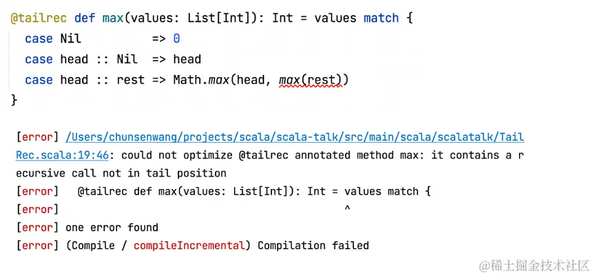 Java 中使用递归函数可能会造成栈溢出(某些 Java 编译器在某些情况下会进行尾递归优化);而在 Scala 中,尾递归(Tail Recursion)是指递归函数中的递归调用发生在函数体的最后一个位置。当函数满足尾递归的条件时,编译器可以对其进行尾递归优化。