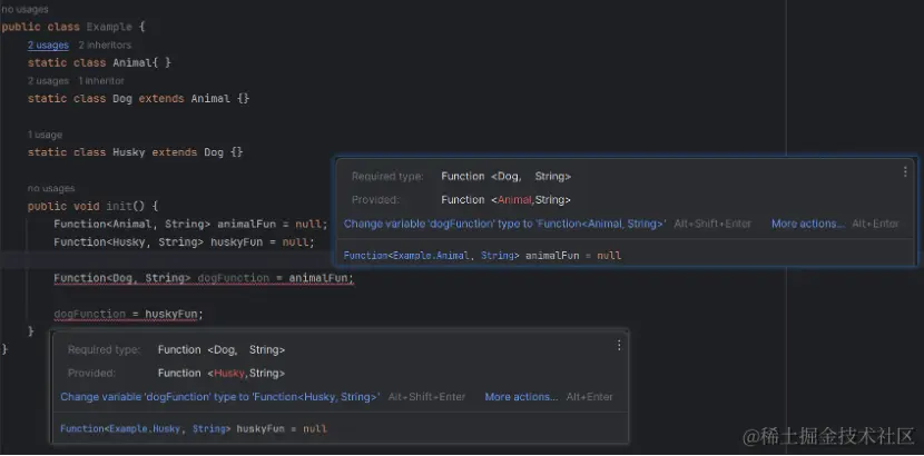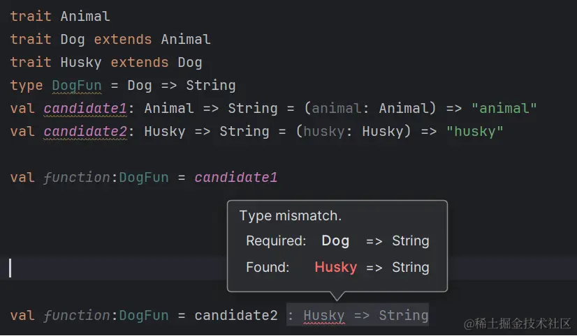 如下图,我们定义了特质 Animal,Dog 继承 Animal,Husk 继承 Dog。Scala 中 Dog 继承了 Animal的特质,可以当作 Animal 的类型,不能当作 Husky 的类型;但在 Java 中都是不可以的(并不符合常理)。