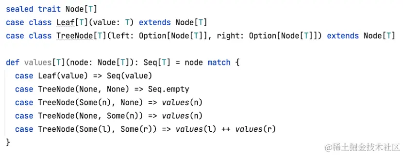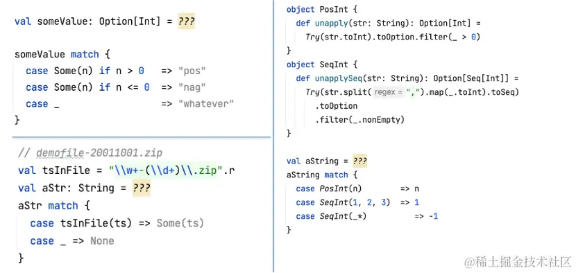 Scala 模式匹配是一种强大的特性,可以用于检查数据类型、数据结构和数值的匹配,并根据匹配的结果执行相应的代码块。如下图所示,通过模式匹配,我们可以非常简单明了地实现一个获取所有叶子节点值的方法。下图展示了一些模式匹配的常见用法。模式匹配不仅可以匹配类型,还可以匹配正则表达式,提高正则表达式代码的可读性。同时我们还可以通过定义 unapply 和 unapplySeq 的方式自定义模式匹配的行为。