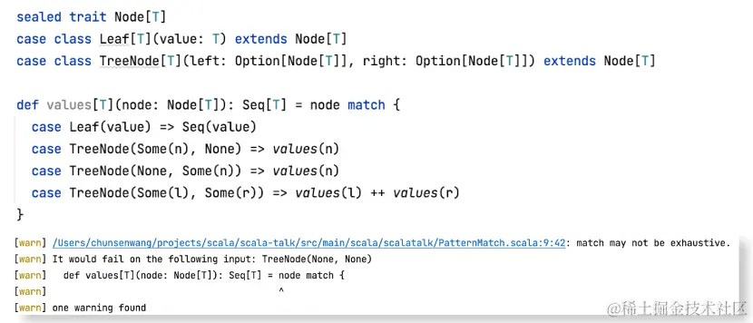 Scala 编译器会检查我们的模式匹配代码是否穷举完了所有的 case,当我们忽略了一些 case,编译器会认为代码可能存在逻辑漏洞。这一特性可以很好地帮助我们发现逻辑中的漏洞,让代码更可靠。