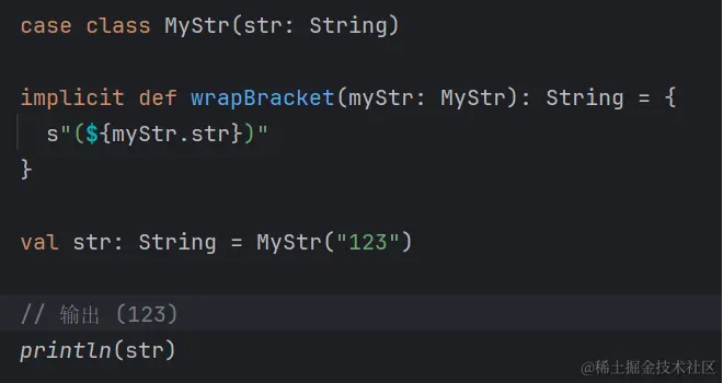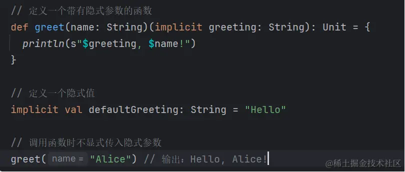 隐式参数是一种特殊的参数,允许我们在调用函数时不显式地传递参数,而是让编译器根据上下文自动查找并传入相应的参数值。这种功能可以帮助简化代码,提高灵活性,并且常用于依赖注入、类型类和其它模式中。下图展示了隐式参数的使用。