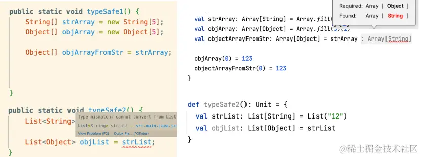 Java 编译器允许把 String 数组赋值给 Object 数组,但在运行时当我们尝试给这个 Object 数组插入一个非 String 对象时就会产生错误。这是 Java 编译器在类型安全上的一个问题。同时,Java 编译器不允许把一个 String 列表赋值给 Object 列表,但是从逻辑上来说,我们希望这个这个赋值是可以发生的。而 Scala 编译器则能够解决了这两个问题,它不允许把一个 Sting 数组赋值给一个 Object 数组,但是允许把一个 String 列表赋值给一个 Object 列表。