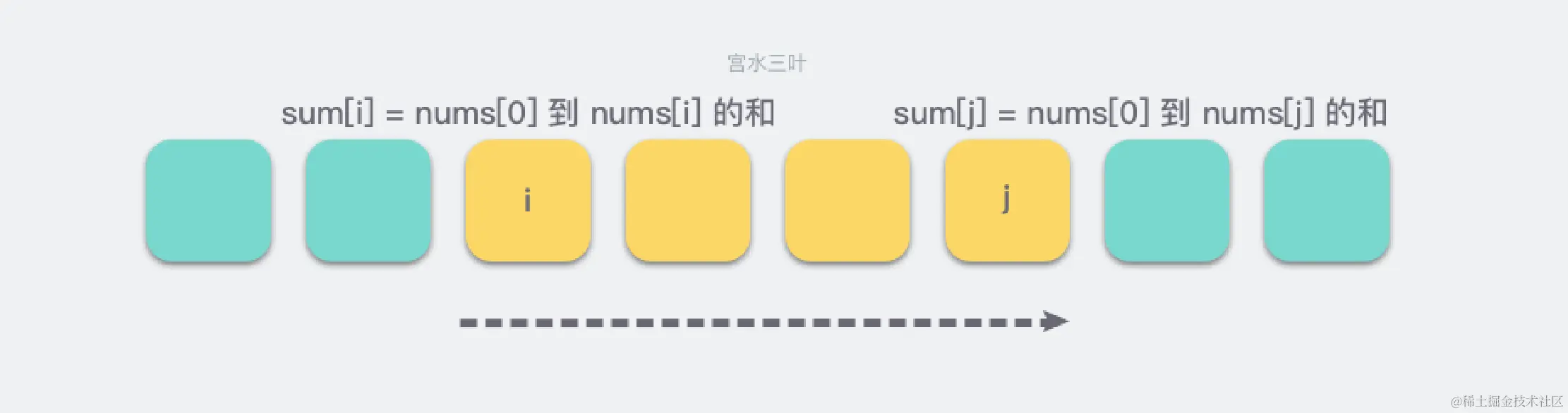 设前缀和数组为 sum,sum 的每一位记录的是从「起始位置」到「当前位置」的元素和。