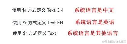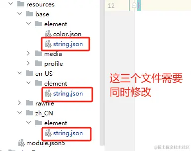 这里需要注意的是,$r 方式默认是根据系统的语言来匹配读取对应语言文件夹下 /element/string.json 文件中对应的值,如果都匹配不到的话,则读取的是 /resources/base/element/string.json,因此,在使用此方式读取值的时候,需要在每种系统语言对应的目录文件中都添加相同 key 的数据,否则会报错