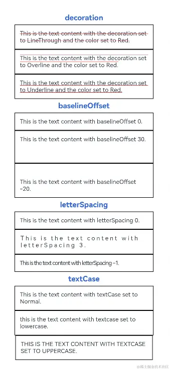 {type: TextDecorationType.None,color:Color.Black} - baselineOffset:设置文本基线的偏移量,默认值0。设置该值为百分比时,按默认值显示