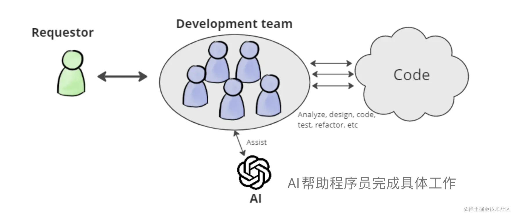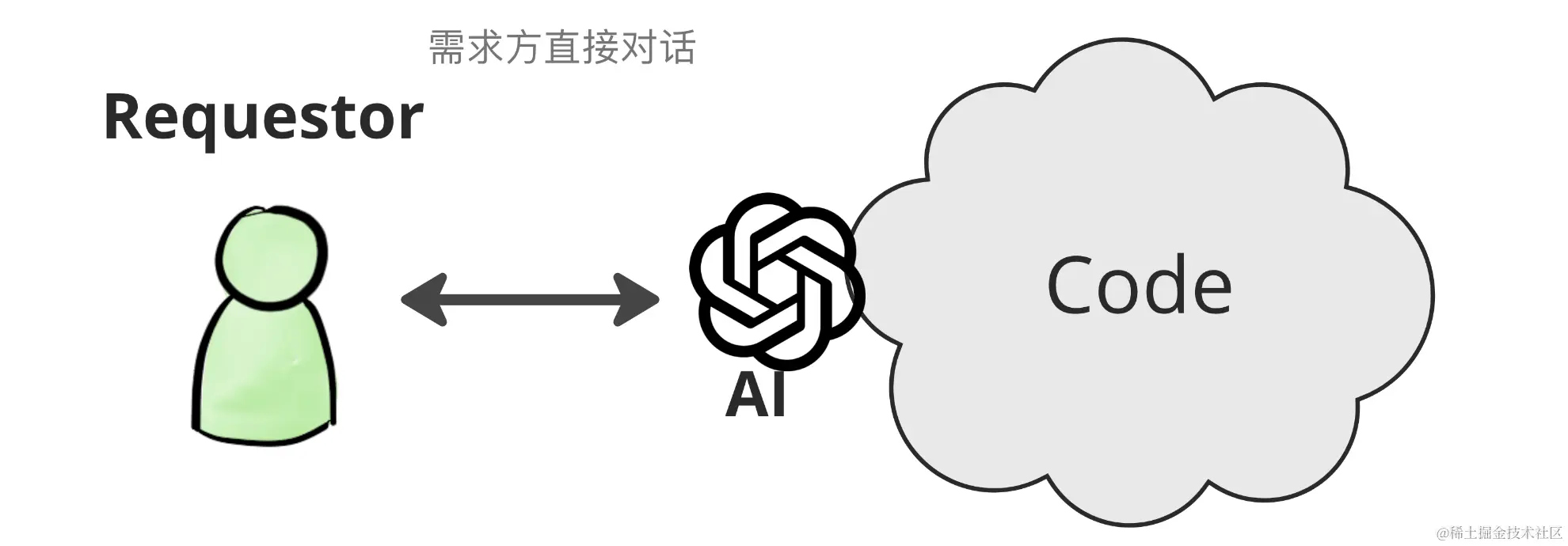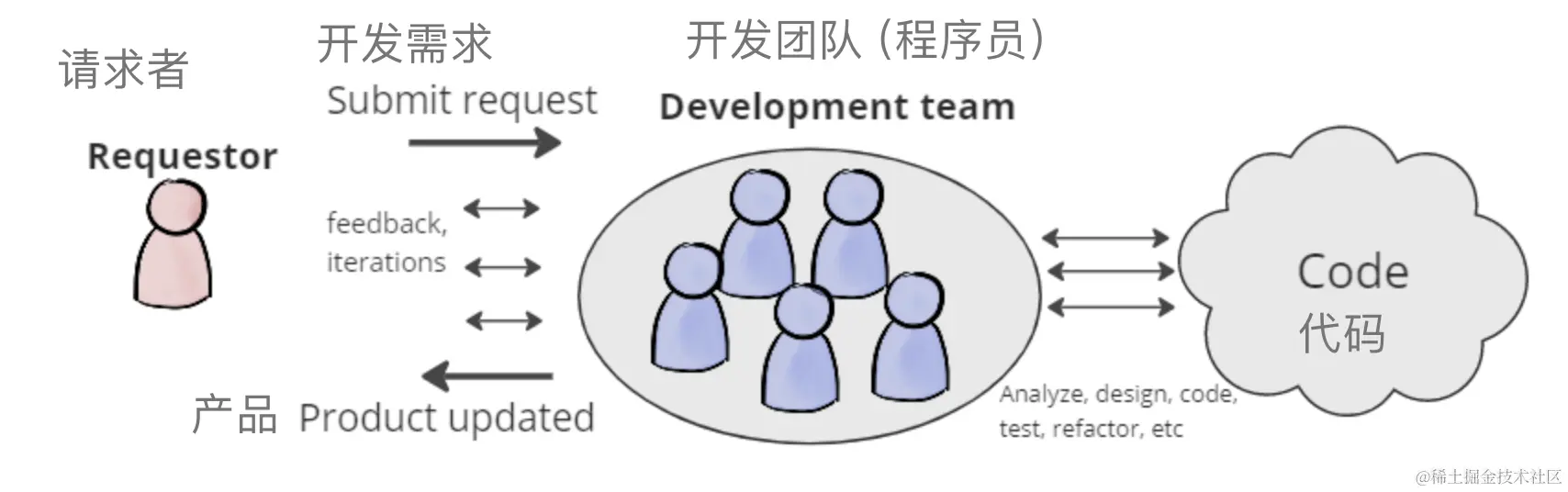 现在想一想。开发团队与人类(我们称之为请求者)交谈,以了解需要开发什么以及为什么。然后他们转身编写代码来实现这一目标。理想情况下,团队会迭代地执行此操作,因此当团队迭代代码并寻求反馈时,会出现一些来回的情况。