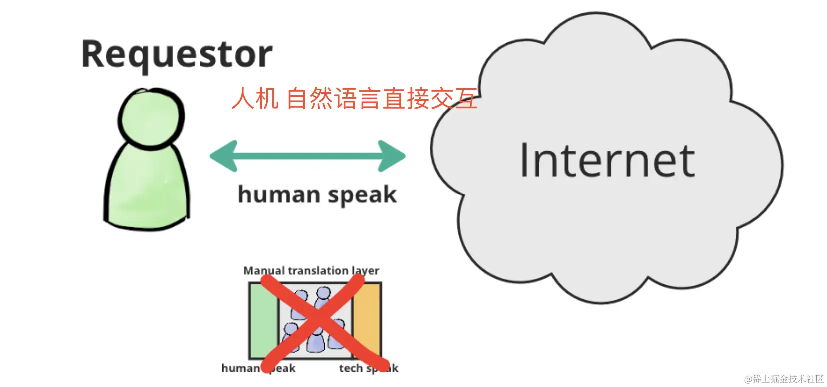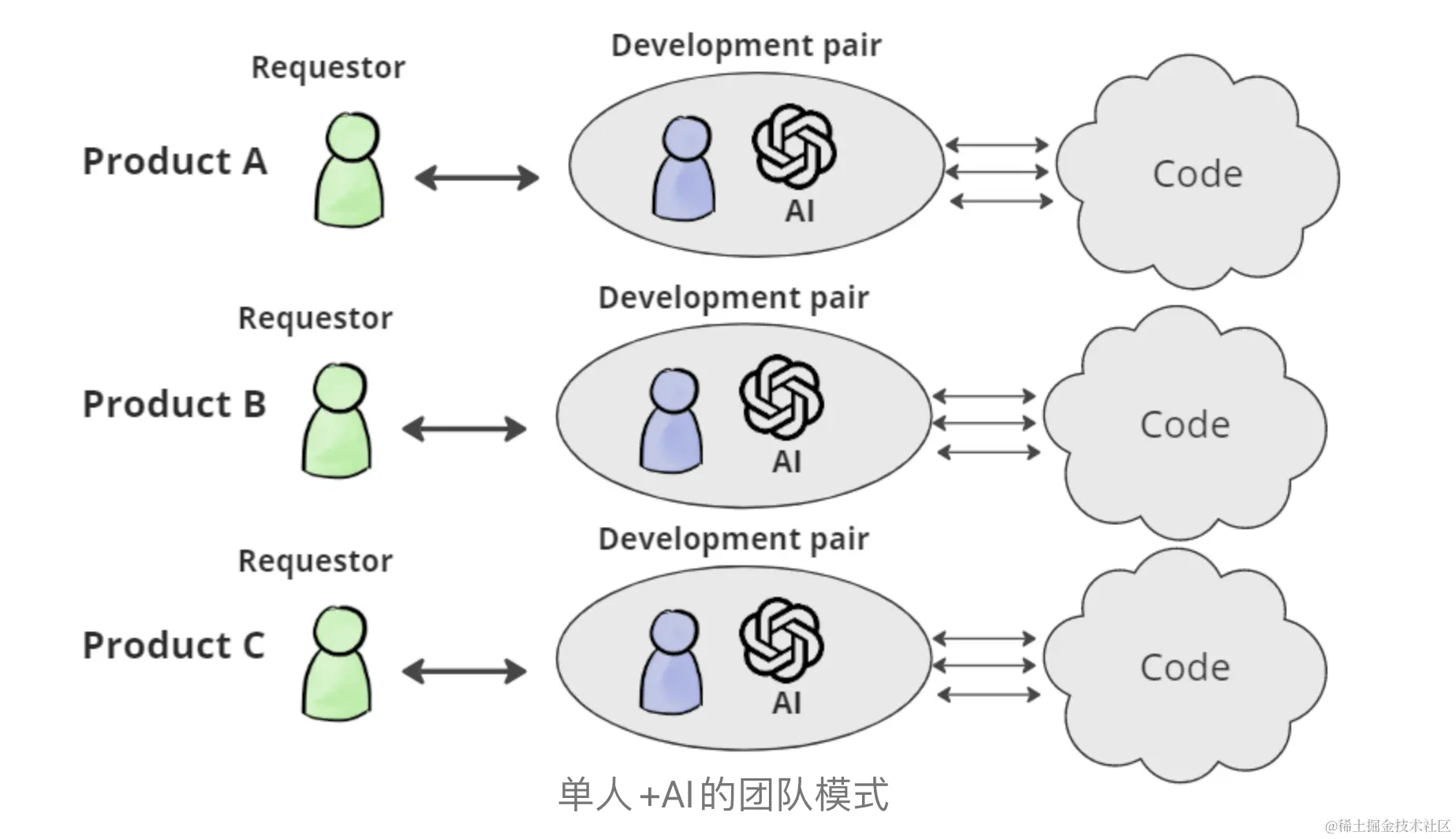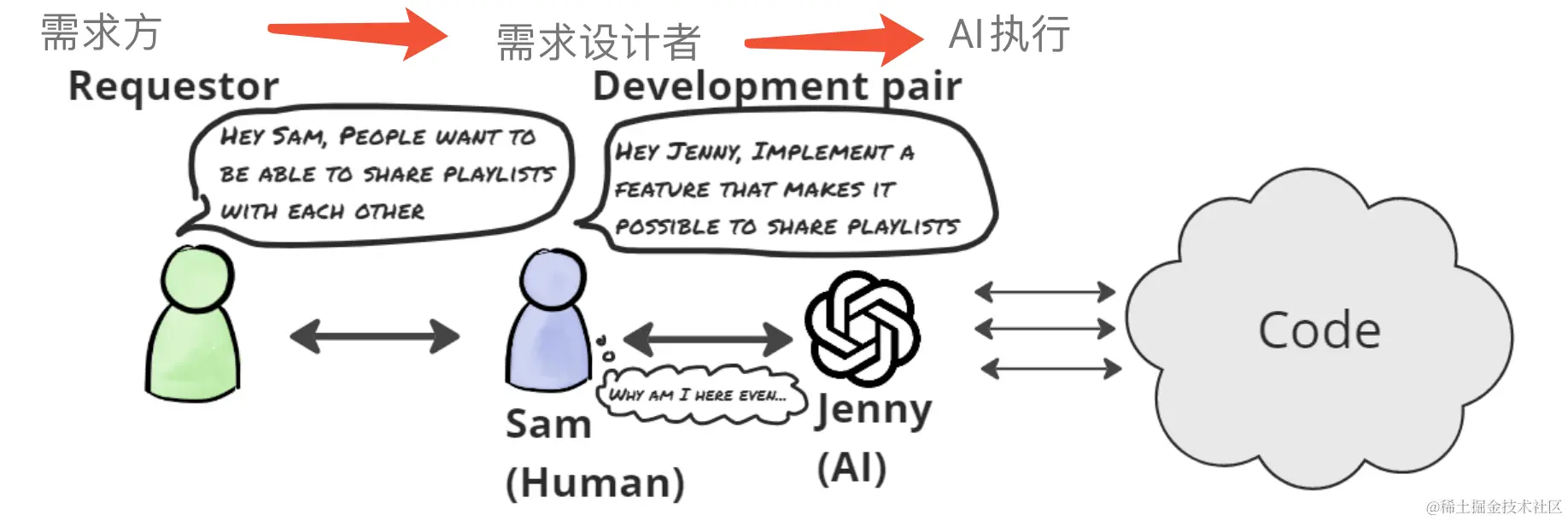现在想一想。开发团队与人类(我们称之为请求者)交谈,以了解需要开发什么以及为什么。然后他们转身编写代码来实现这一目标。理想情况下,团队会迭代地执行此操作,因此当团队迭代代码并寻求反馈时,会出现一些来回的情况。