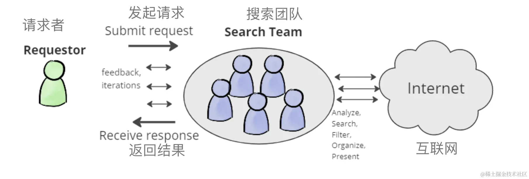他们收到公司其他人的搜索请求,我们称他们为请求者(Requestor)。每次搜索有时需要几天甚至几周的时间,团队花时间与请求者讨论并了解需要哪些信息以及原因,然后他们需要找出要查阅的来源,编写精心设计的查询,处理错误,组织、验证和过滤结果,然后将其呈现结果。对于更复杂的搜索,在团队得出最终搜索结果之前,需要对搜索结果进行多次迭代的反馈循环。每个这样的循环可能需要几天的时间,因此最终结果可能需要几周的时间。
