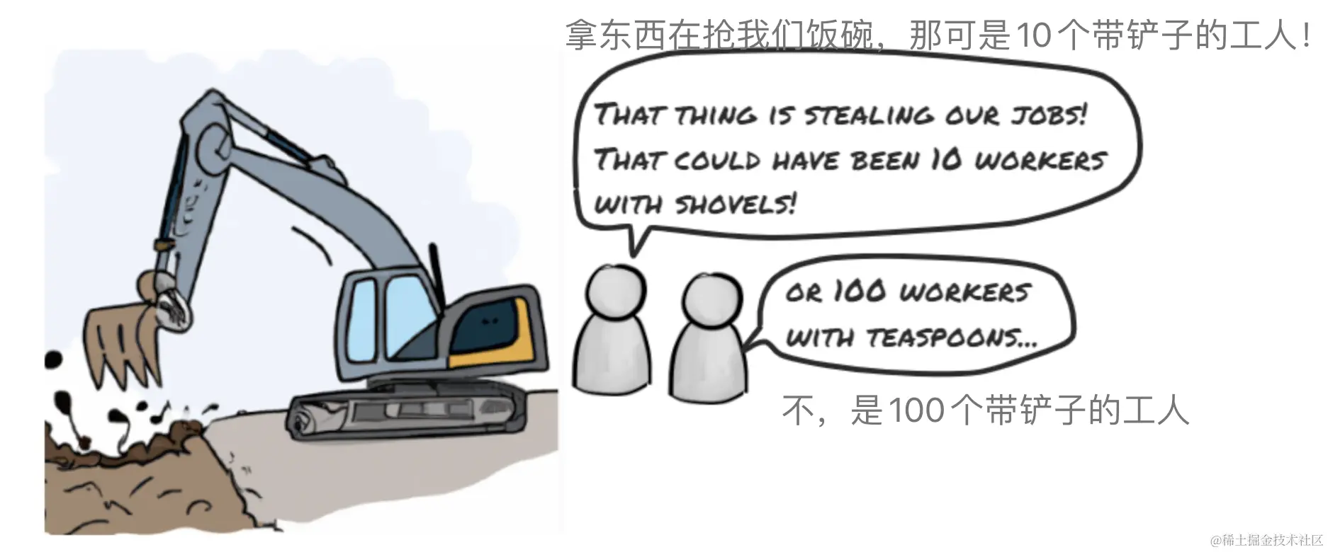 看上面的漫画。如果你能消灭挖掘机,并说“从现在开始挖掘机是非法的,一切都必须用铲子挖”……这会让世界变得更美好吗?