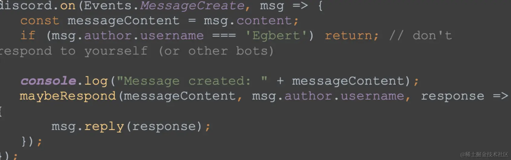 这是 Copilot 昨天为我编写的一些代码的示例。我正在使用 Node js 编写一个 Discord 机器人。我从未使用过 Discord API,而且我的 JavaScript 技能有点生疏。但这并不重要。我开始输入第一行,Github Copilot明白我的意思并提出完成它。然后我开始写第二行,它完成了整个功能 - 包括我可能会错过的“不要回应自己”部分。我估计我用了大约一半的时间就完成了Discord 的机器人,并且大部分代码是由 Copilot 编写的。代码并不完美,需要进行一些小的清理,但生产力的提高是非常明显的。
