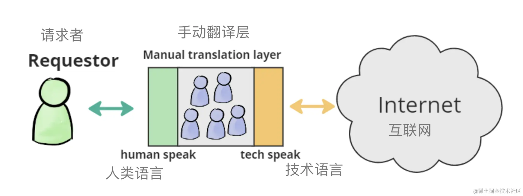 在此模型中,搜索团队本质上是请求者和互联网(Internet)之间的手动翻译层(Manual Translation Layer)。简而言之,请求者讲的是人类语言,而互联网讲的是技术语言,因此需要有人进行翻译——即讲两种语言的高薪专家。