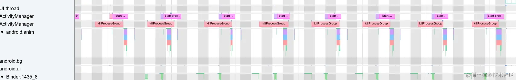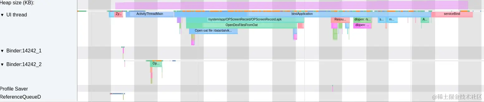 下面这个 Trace 是低内存情况下 , 抓取的一个 App 的冷启动 , 我们只取应用启动到第一帧显示的部分 ,总耗时为 2s 。