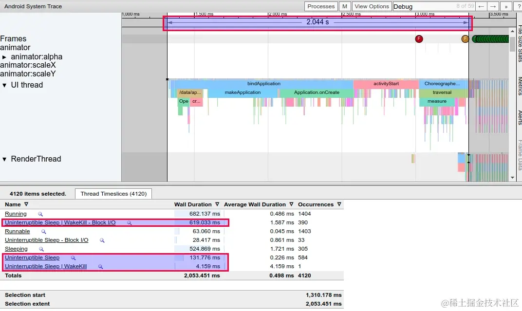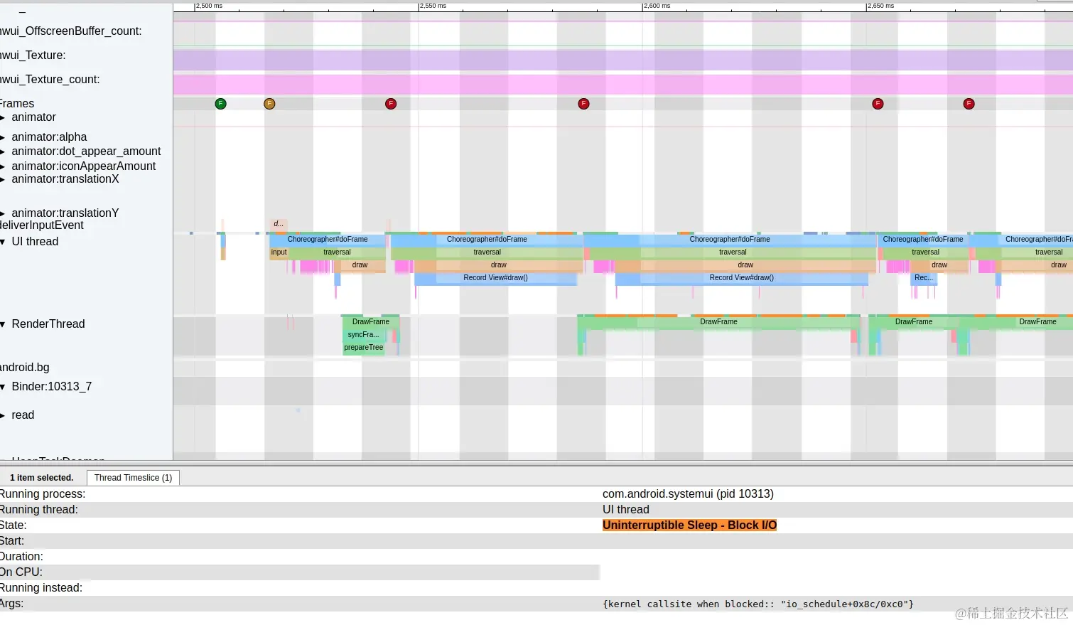 当出现大量的 IO 操作的时候,应用主线程的 Uninterruptible Sleep 也会变多,此时涉及到 io 操作(比如 view ,读文件,读配置文件、读 odex 文件),都会触发 Uninterruptible Sleep , 导致整个操作的时间变长