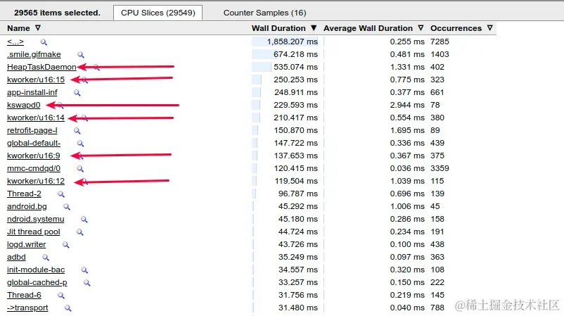 从这段时间内的 CPU 使用情况来看,除了 HeapTaskDeamon 跑的比较多之外,其他的内存和 io 相关的进程也非常多,比如若干个 kworker 和 kswapd0.
