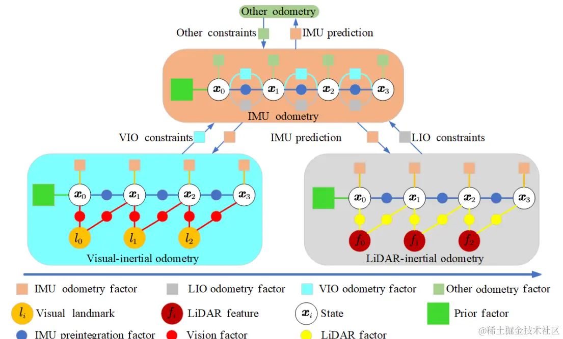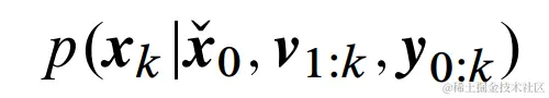 在SLAM中,先验值通常是从传感器(例如IMU和编码器)递归得出的。测量值通常从传感器获得,例如GPS、摄像头和激光雷达。后验值是融合结果,也是定位输出。在实际的机器人状态估计中,估计后验概率密度可以表示为: