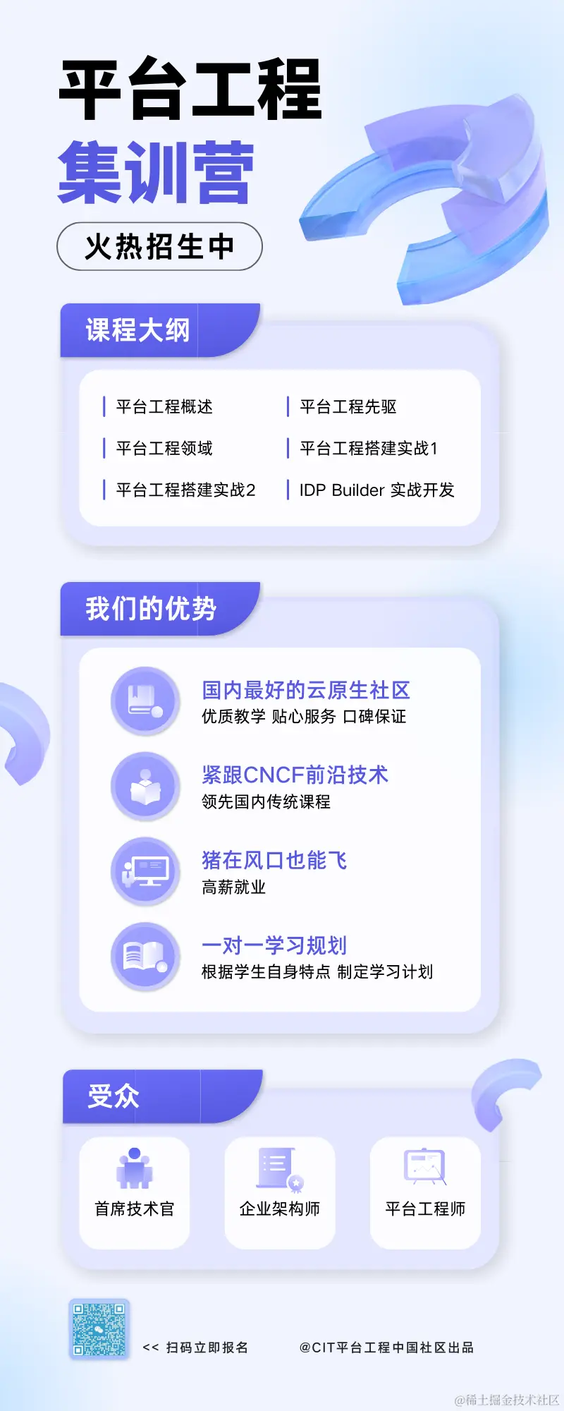 在快速发展的云原生领域中,平台工程成为塑造数字未来的核心。你是否渴望成为这一变革的领导者?我们为您提供了一门独一无二的平台工程课程,旨在深度培养您在这个领域的技能,让您在激烈的市场竞争中脱颖而出。