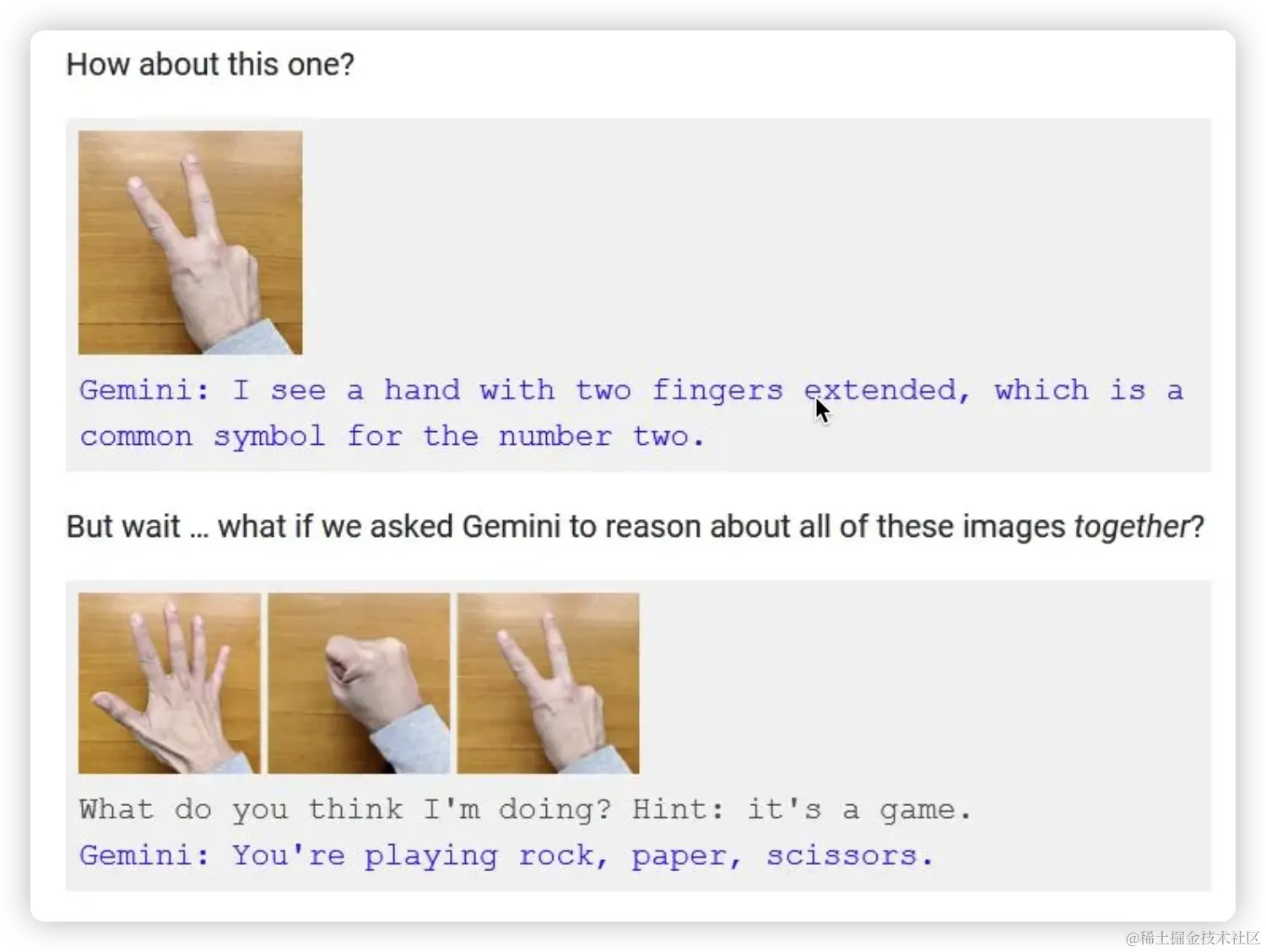 但是随即,视频很快被打脸,比如猜拳,是通过发送静态图片和提示语,引导 Gemini 去说出答案: