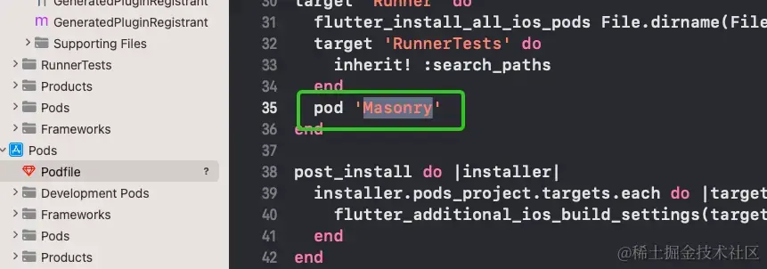 因为写视频播放器的时候用到了Masonry三方,所有用户需要再Podfile里面加入pod 'Masonry',然后cd到Runner目录下,运行pod install安装Masonry