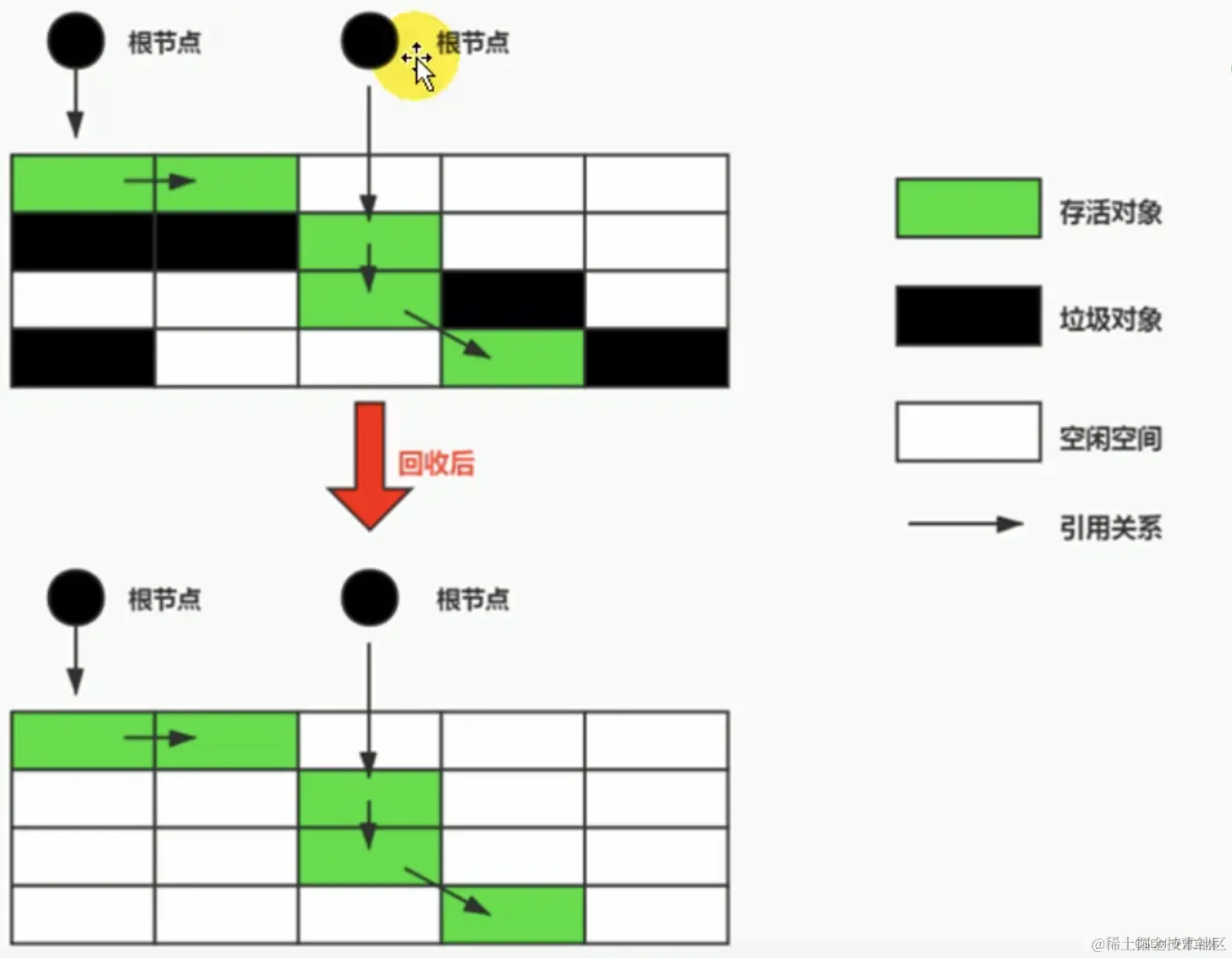 小技巧:由于Root采用栈方式存放变量和指针,如果一个指针,它保存了对内存里面的对象,但是它自己又不在堆内存里面,那它就是一个Root。
