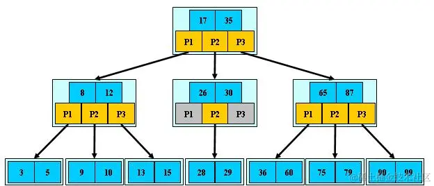 - 非叶子节点的子树指针 P[i],指向关键字值 [K[i],K[i+1]) 的子树