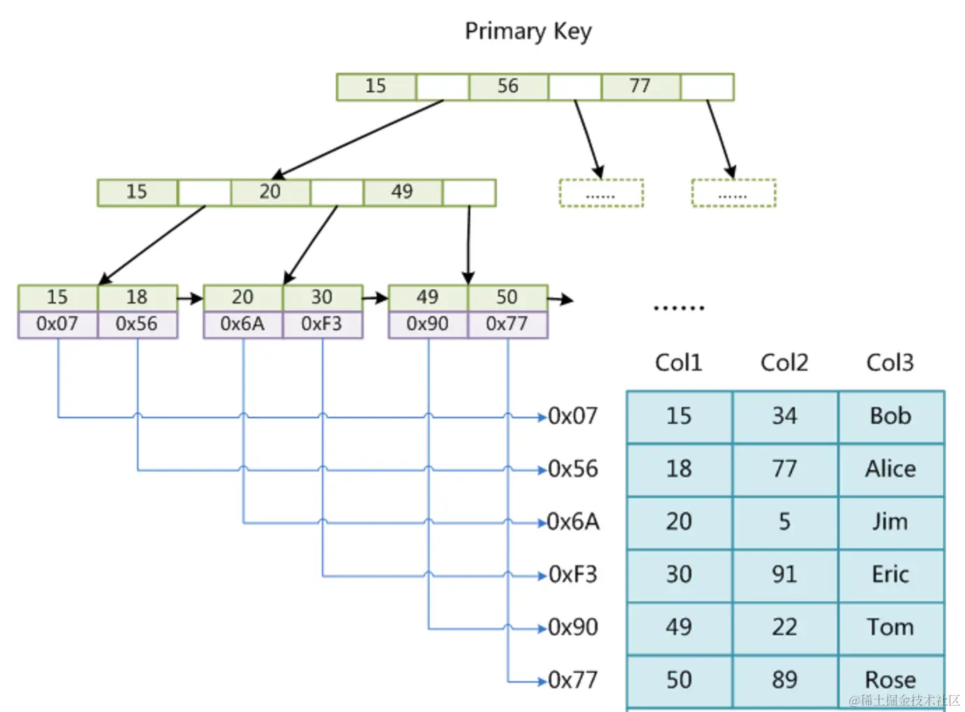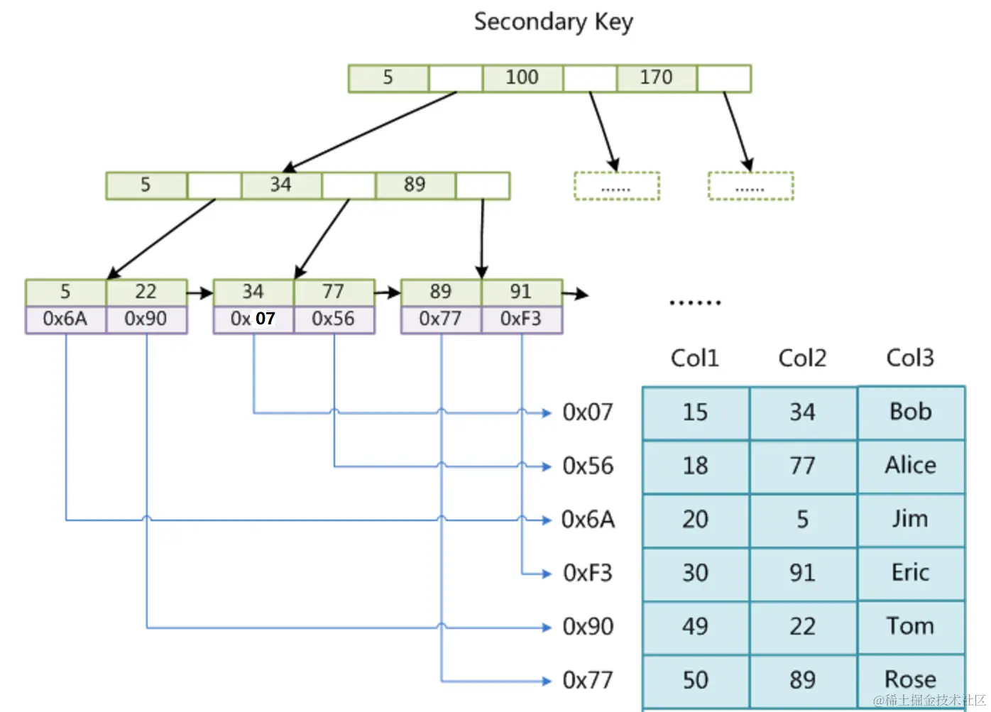 与 MyISAM 索引的不同是 InnoDB 的辅助索引 data 域存储相应记录主键的值而不是地址。例如,定义在 Col3 上的一个辅助索引: