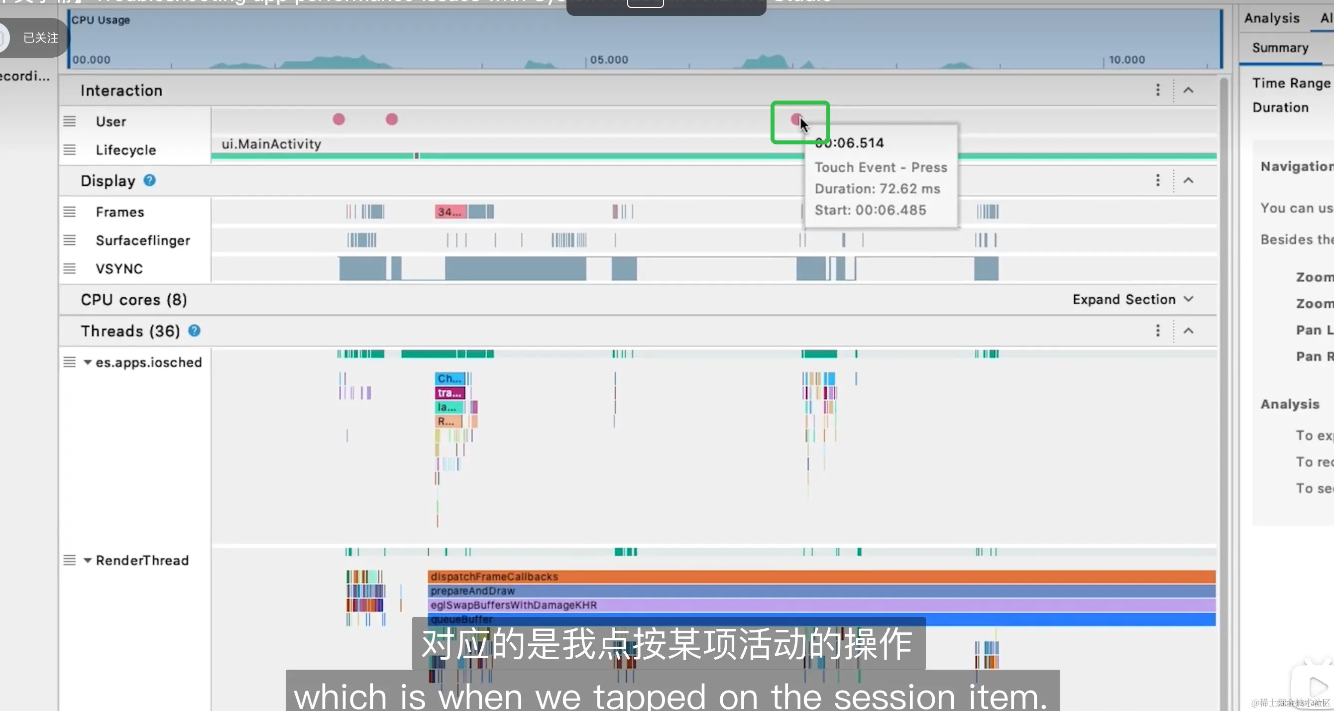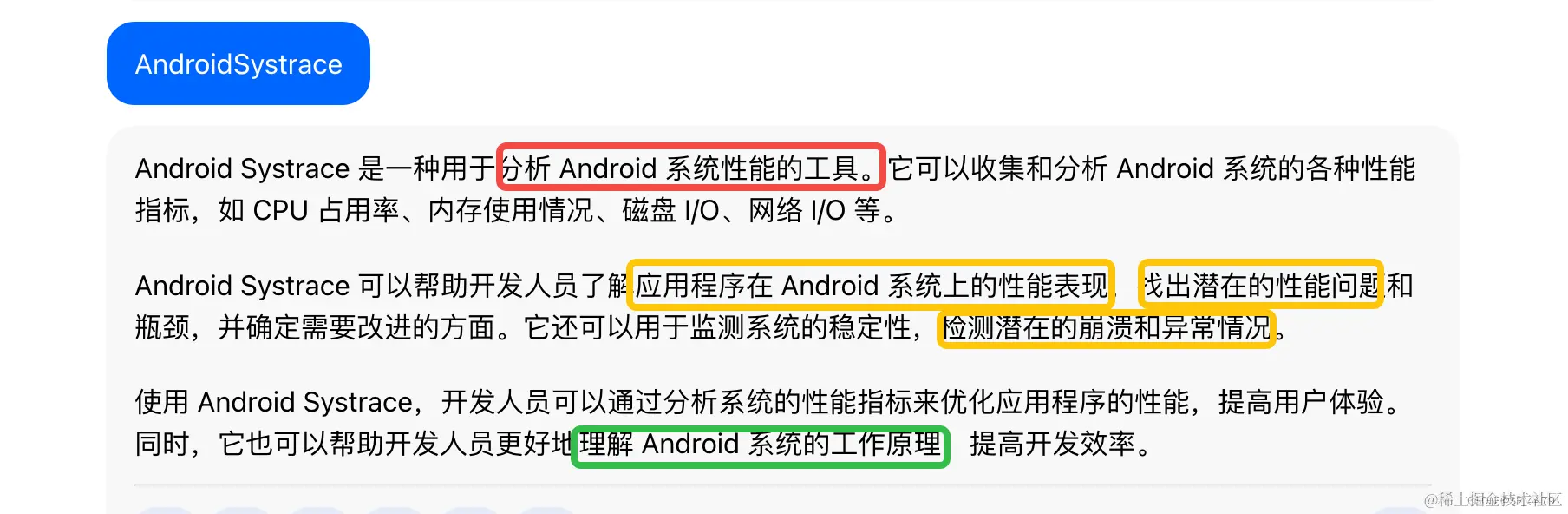 答:例子?!啪,一个链接扔过去,自己看【中文字幕】Troubleshooting app performance issues with System Trace in Android Studio_哔哩哔哩_bilibili