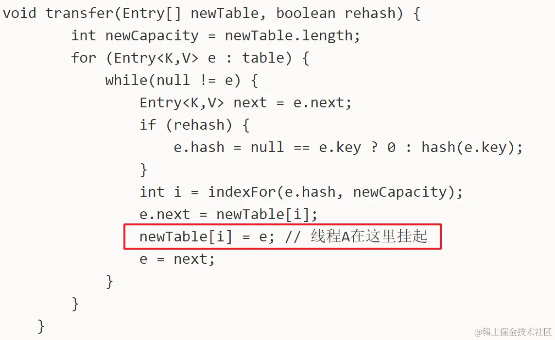 然后在多线程环境下,假设有两个线程A和B都在进行put操作。线程A在执行到transfer函数中第11行代码处挂起,因为该函数在这里分析的地位非常重要,因此再次贴出来。