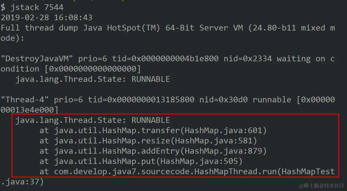 这里我们着重分析为什么会出现死循环的情况,通过jps和jstack命名查看死循环情况,结果如下: