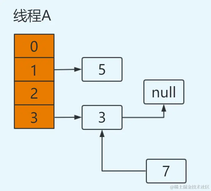 此时切换到线程A,在线程A挂起时:e=7,next=5,newTable[3]=null。