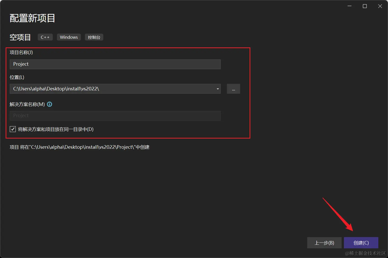 项目名称、选择项目保存位置,选择将解决方案和项目放在同一目录中,点击创建: